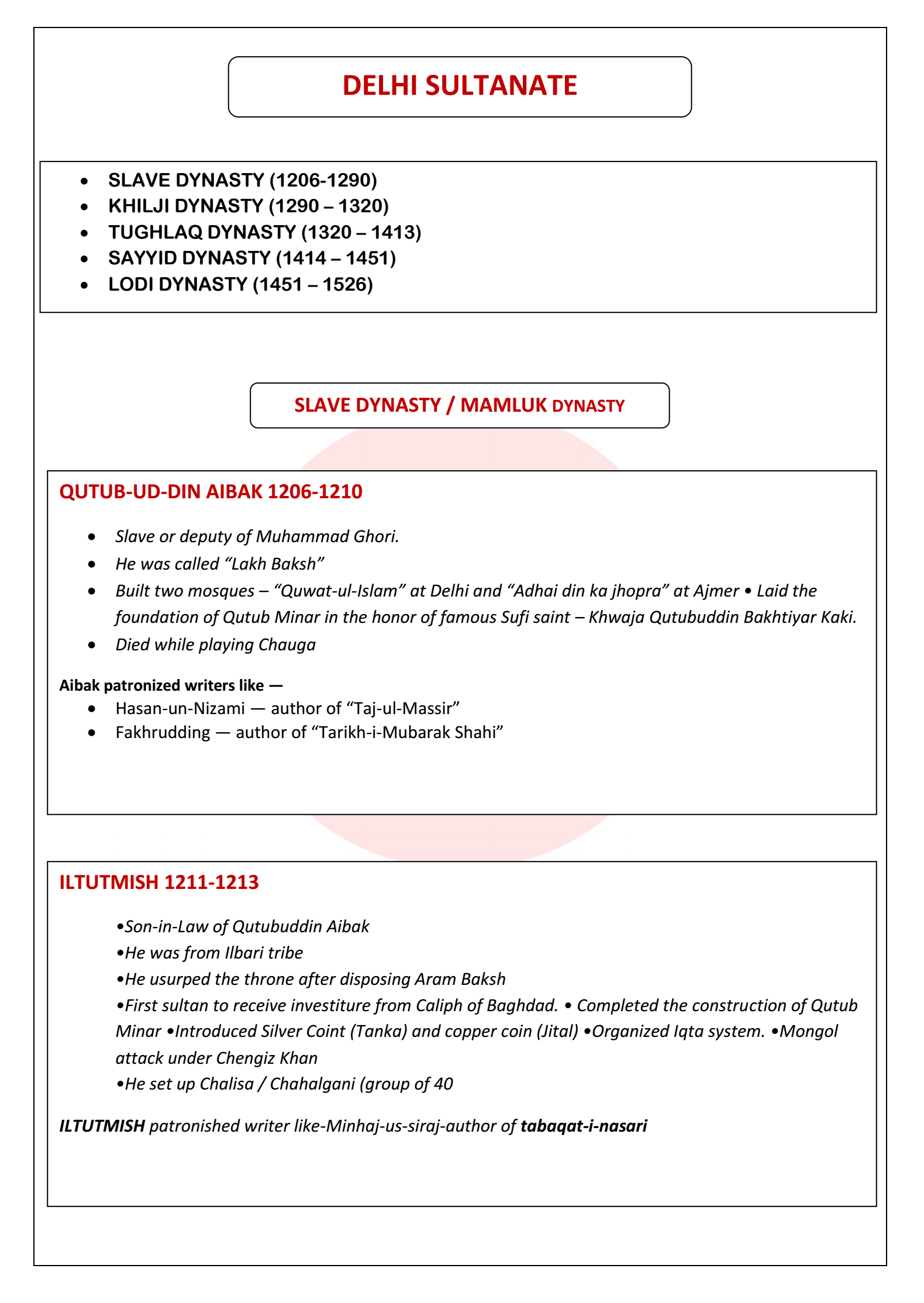 Delhi Sultanate: Slave, Khalji, Tughlaq, Sayyid & Lodi dynasties explained in detail